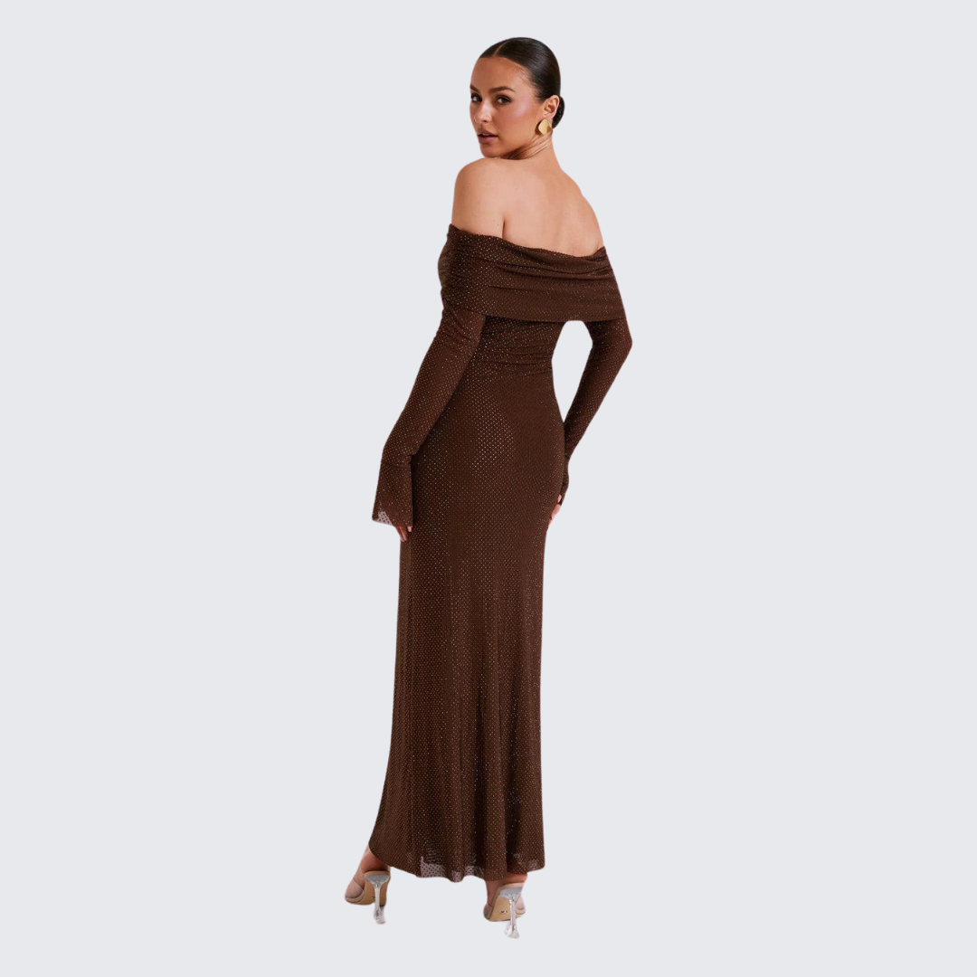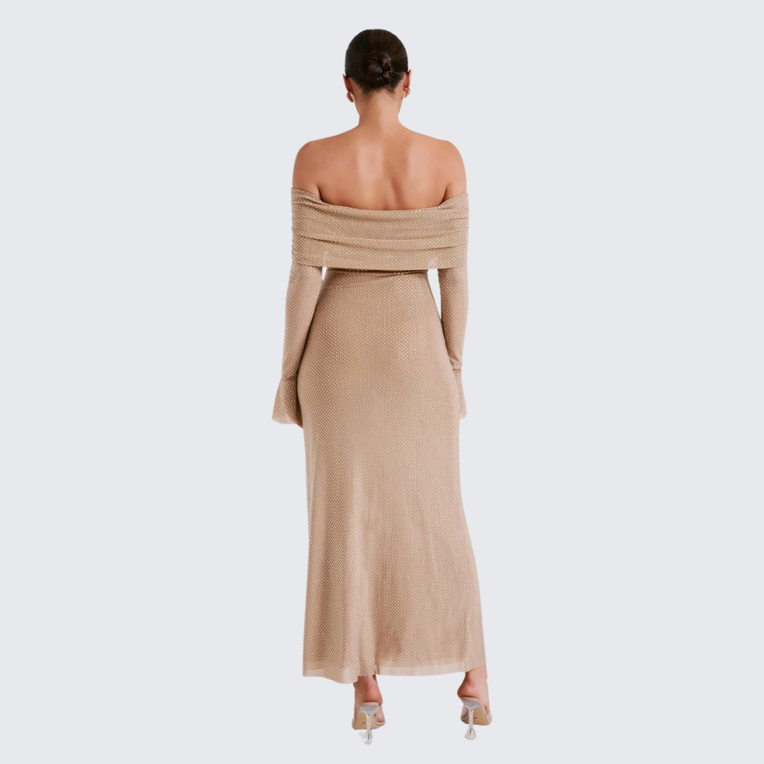 Erleben Sie pure Eleganz mit dem Glitzerkleid Emma, das für einzigartige Momente entworfen wurde. Dieses schulterfreie, langärmelige Kleid strahlt zeitlose Klasse aus und ist perfekt für einen besonderen Abend. Dieses Angebot läuft heute Abend aus, also verpassen Sie es nicht!